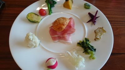 【新玉ネギのチーズシュークリームとはしり野菜のメドレー】